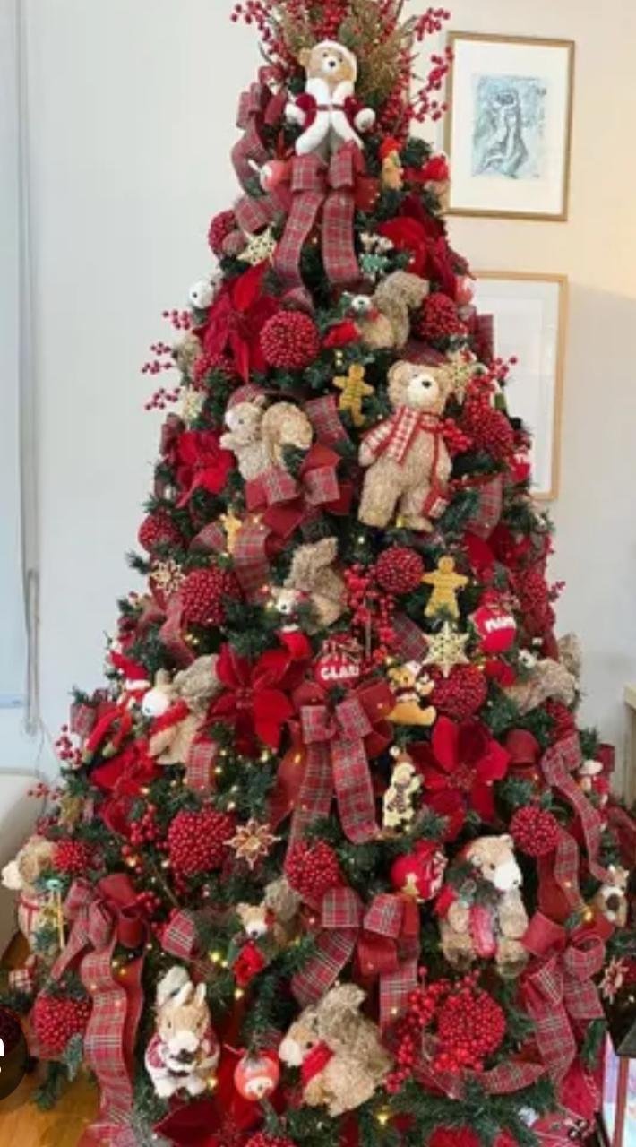 Árvore de Natal Decorada Vermelha com Laços, Ursinhos e Elementos Natalinos