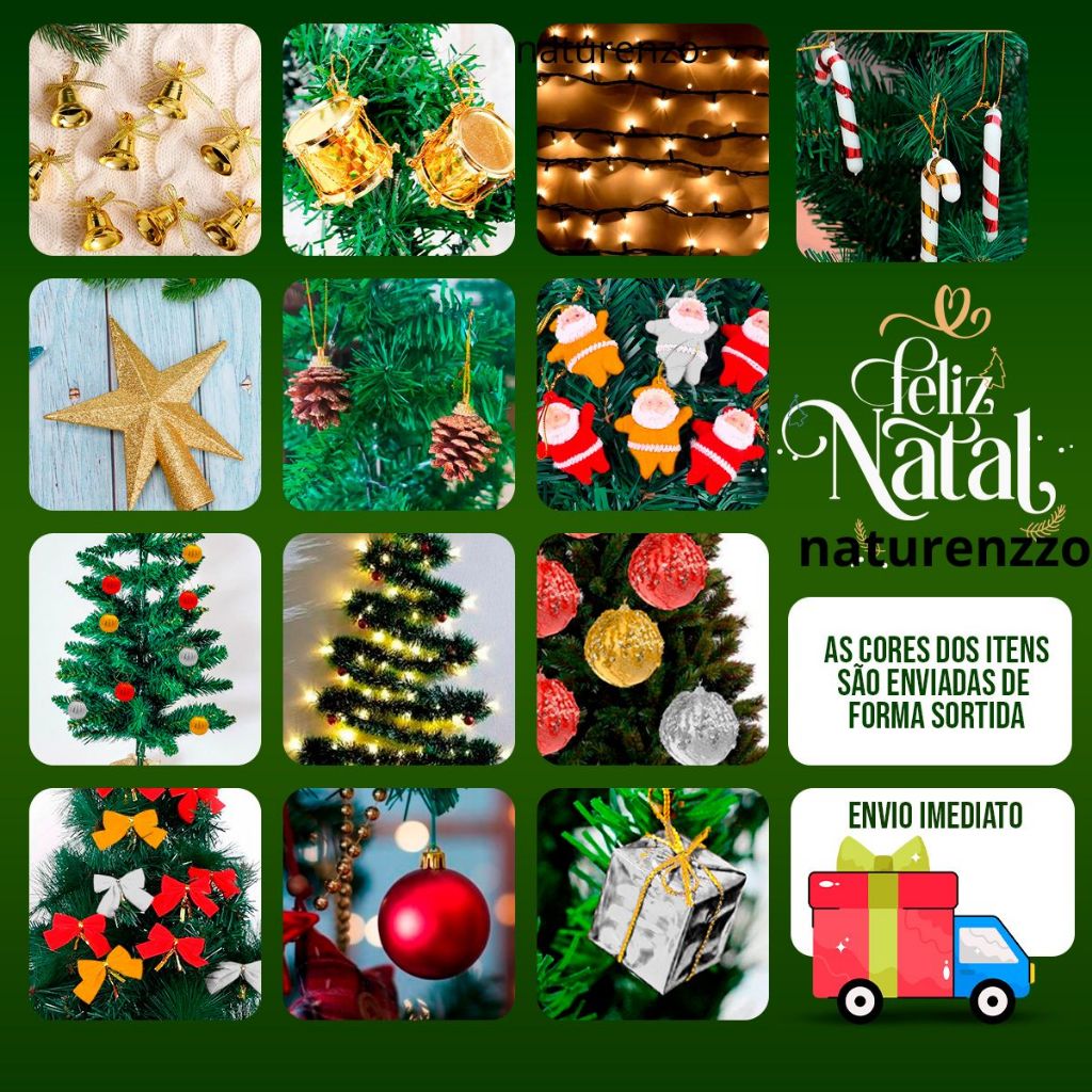 100 enfeites sortidos (30 bolinhas + 70 itens variados como renas, pinhas, gorros, presentinhos)