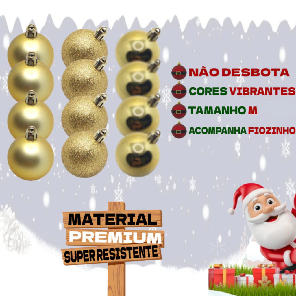 Atenção: os enfeites são enviados conforme disponibilidade em estoque, mantendo padrão de cores uniforme (todos dourados, pratas ou vermelhos) para um visual elegante e harmonioso.
