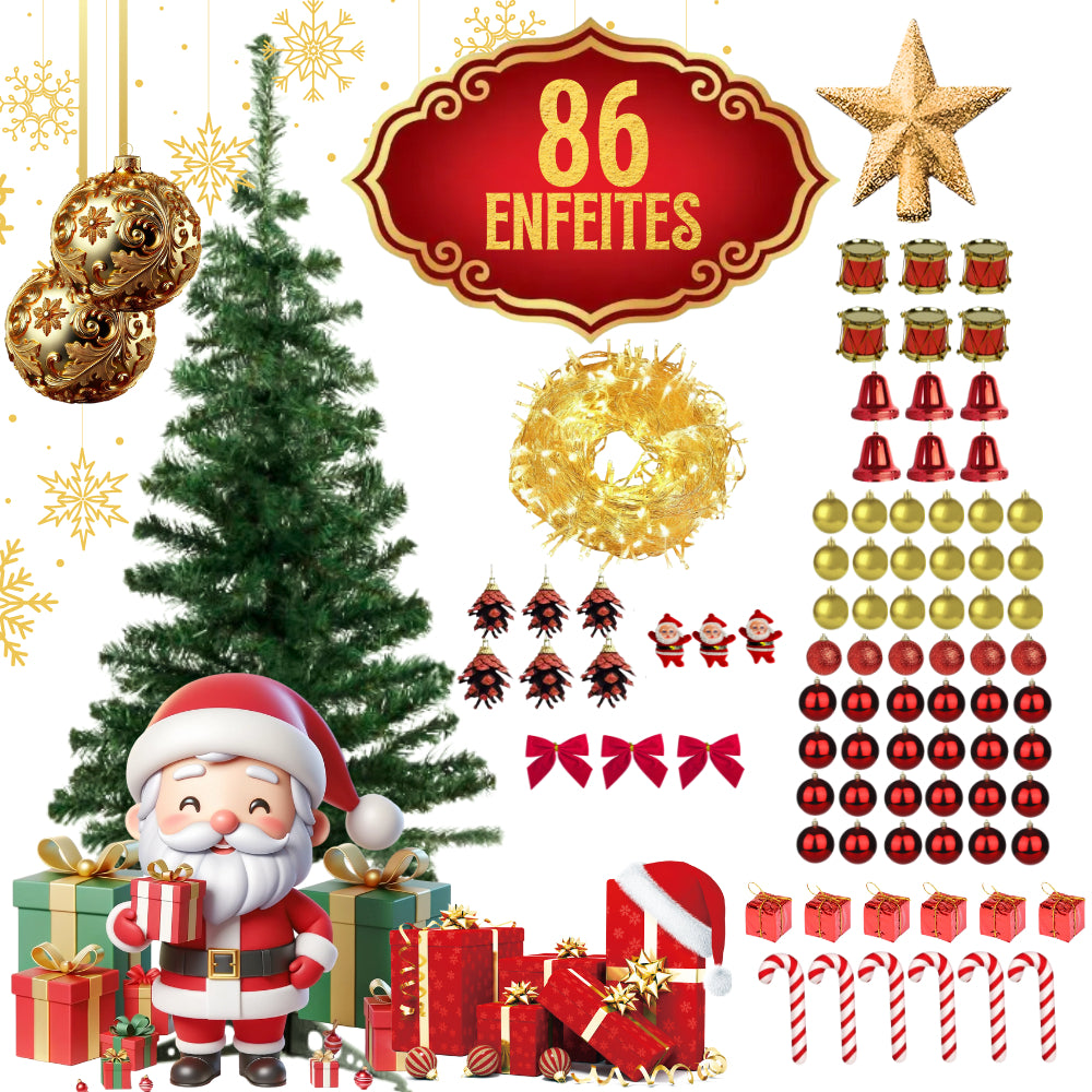 86 enfeites inclusos: bolas, laços, presentinhos e outros itens decorativos prontos para pendurar, permitindo uma decoração personalizada.